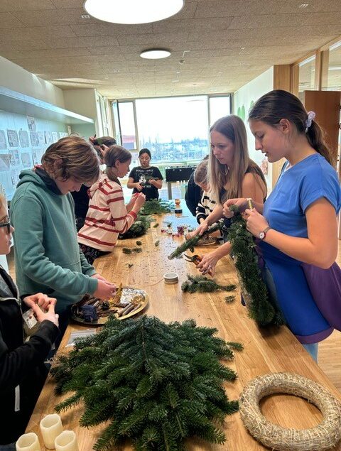 Am Freitagnachmittag trafen sich die drei Lehrerinnen für katholische Religion zum Adventkranzbinden. Tatkräftig unterstützt wurden sie dabei von motivierten NICE-Schüler:innen, die jedem Adventkranz eine persönliche Note verliehen.