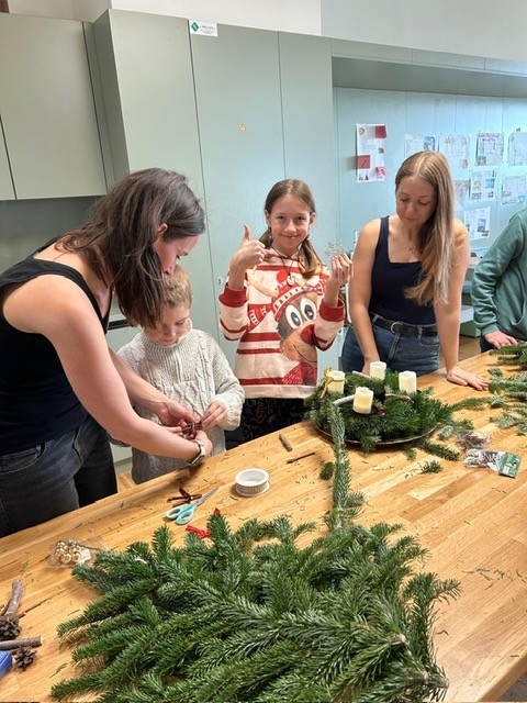 Am Freitagnachmittag trafen sich die drei Lehrerinnen für katholische Religion zum Adventkranzbinden. Tatkräftig unterstützt wurden sie dabei von motivierten NICE-Schüler:innen, die jedem Adventkranz eine persönliche Note verliehen.