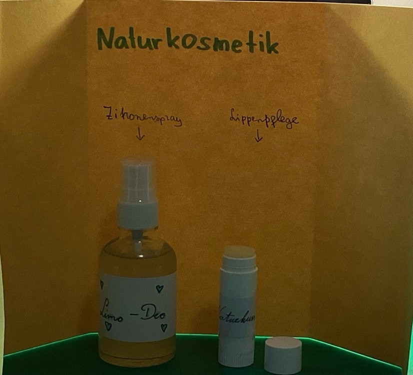 Im Naturkosmetik-Workshop haben wir gelernt, dass man mit der Natur viel anfangen kann, zum Beispiel Naturkosmetik herstellen. Hergestellt haben wir einen vielseitig einsetzbaren Zitronenspray, der als Deo für die Achseln und die Füße verwendbar ist und auch als Mundspray dient. Außerdem haben wir eine Lippenpflege gemacht, die feuchtigkeitsspendend, desinfizierend und wundheilend wirkt.