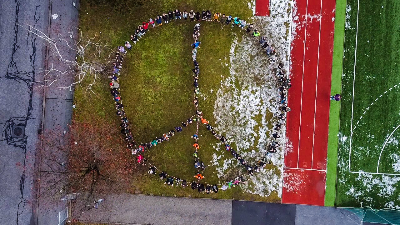Im Anfangsritual zu Schulbeginn haben wir uns einen friedlichen Umgang miteinander vorgenommen. Anlässlich des Tages der Menschenrechte und des nahenden Weihnachtsfestes, das auch das Fest des Friedens ist, haben die Schüler:innen unserer Schule mit ihren Lehrer:innen ein unübersehbares Zeichen des Friedens gesetzt: auf dem Sportplatz wurde ein überdimensionales Peace-Zeichen geformt.