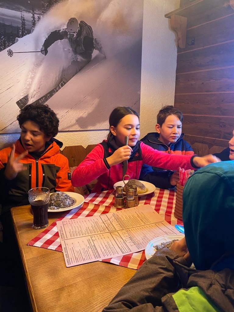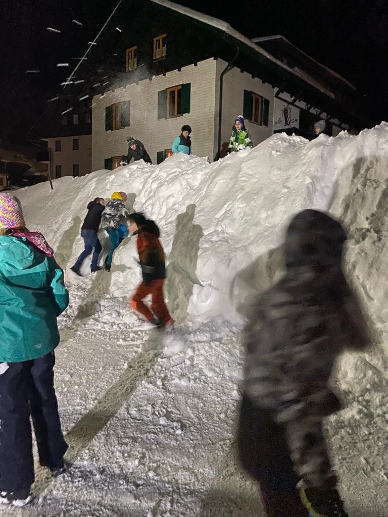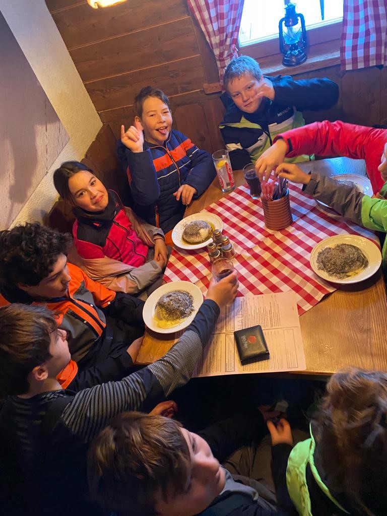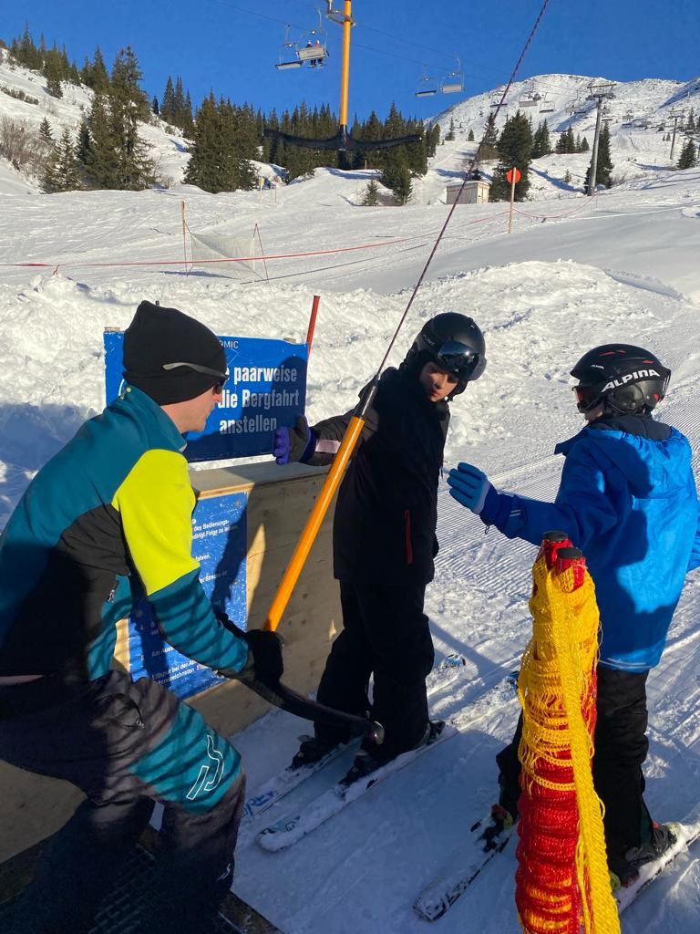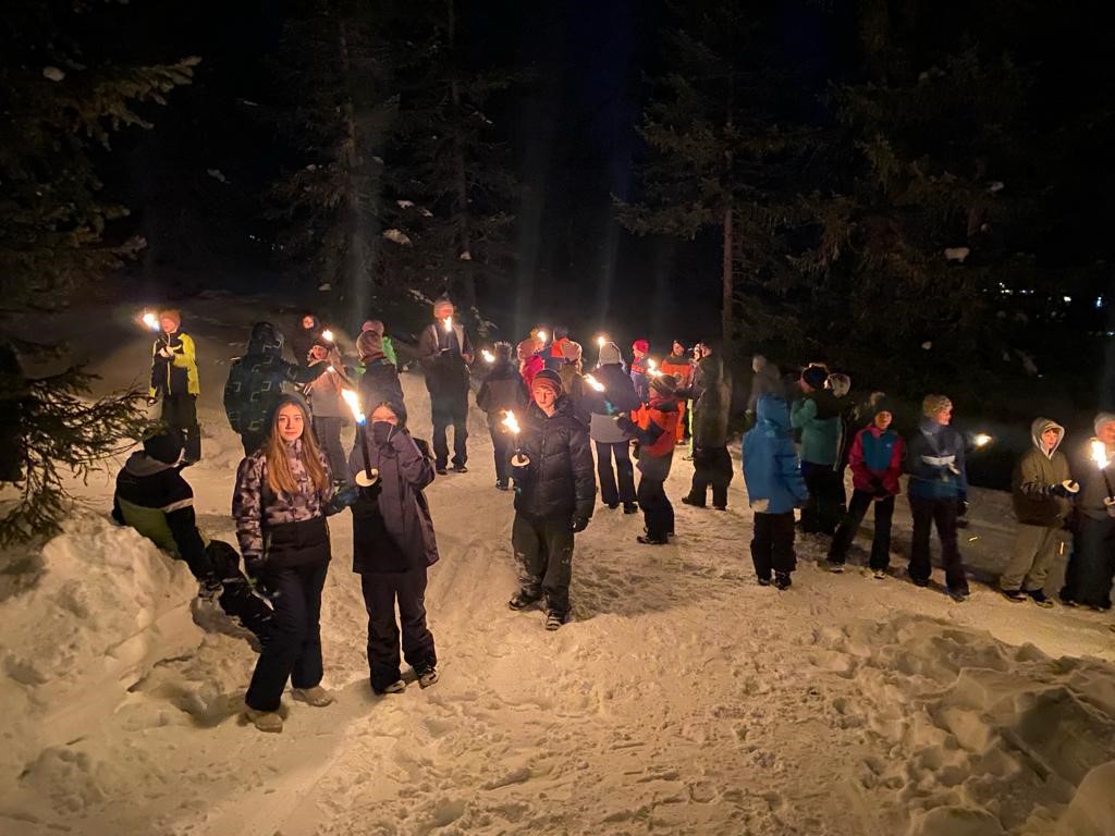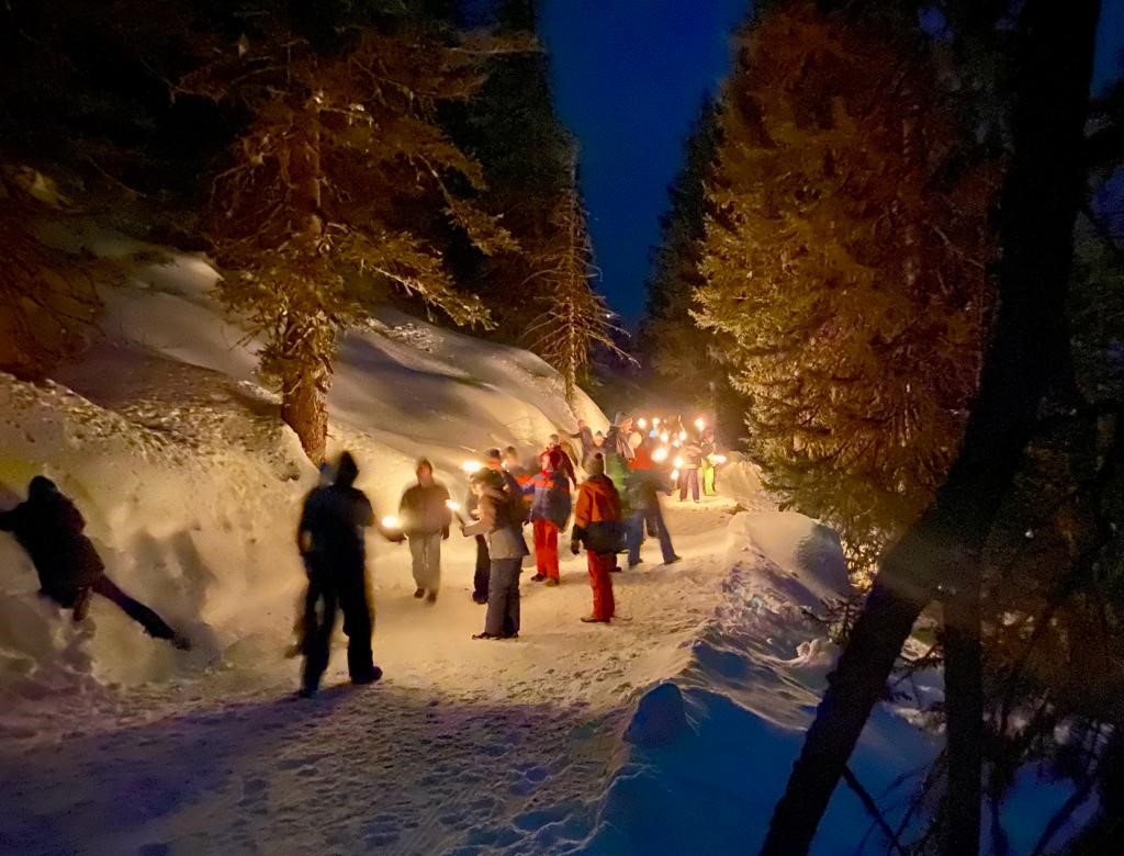 In den ersten Tagen gab es auch beste Wetterbedingungen – ohne Wind. Inzwischen können alle mit dem Sessellift fahren und auch unsere Anfänger kurven schon wie die Profis die Pisten hinunter. Abends gibt es dann Lawinenkunde und Fackelwanderung.