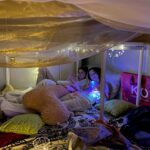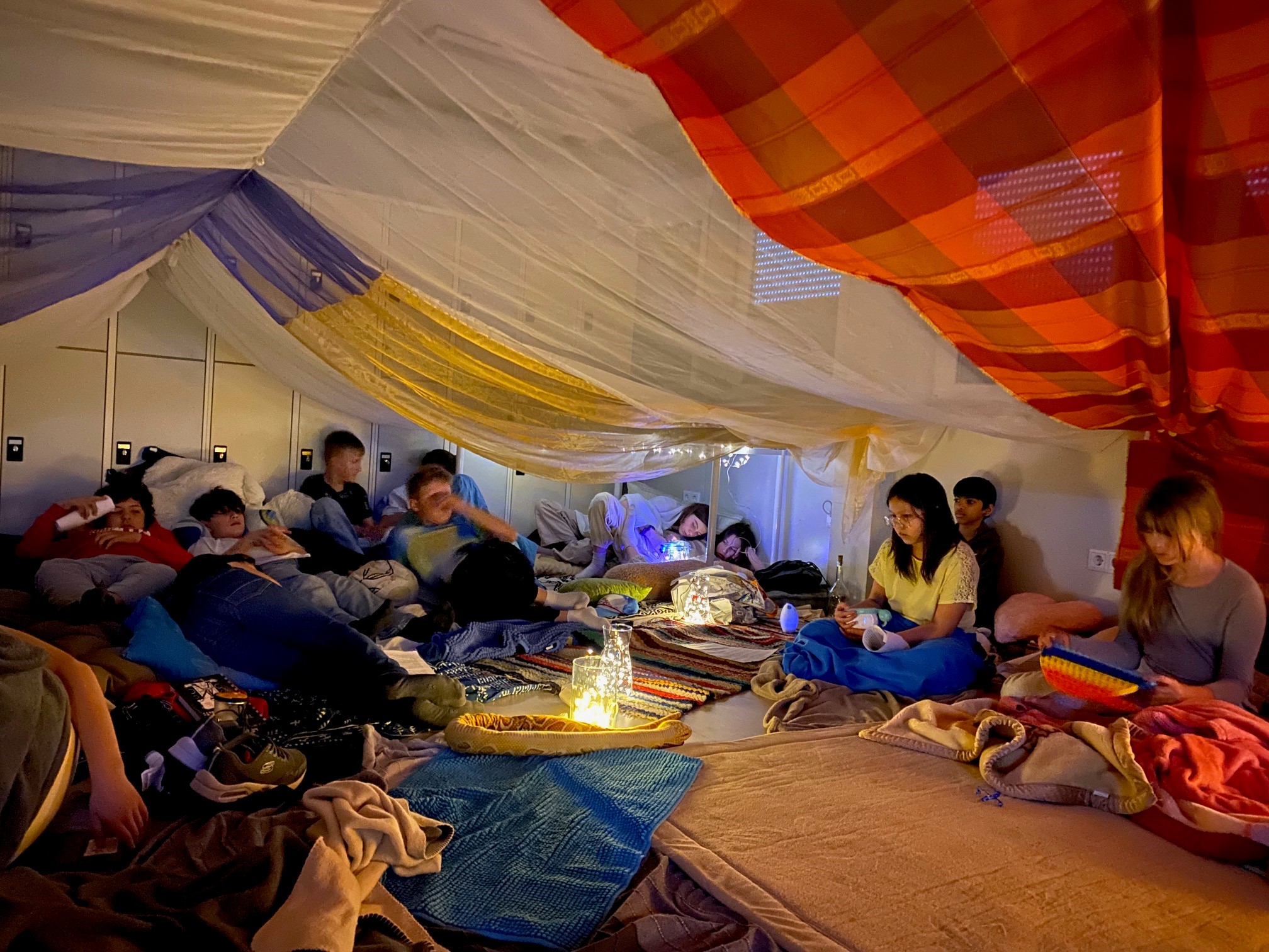 Unter dem Motto „1001 Nacht“ trafen sich am Dienstagabend die Schüler:innen der 1d und 1e ab 16:30 Uhr in der Schule. Die Lehrer:innen hatte unseren Bewegungsraum im 1. Stock als arabisches Zelt umgestaltet. Einige Kinder bereiteten das Abendessen zu. Insgesamt wurden über 120 Brote geschmiert. Jede Klasse las dann schließlich die Geschichte „Aladdin und die Wunderlampe“ gemeinsam in entspannter Atmosphäre. Am Ende blieb dann bis 21:30 Uhr auch noch etwas Zeit für freies Lesen in der selbst mitgebrachten Lieblingslektüre in unterschiedlichen Sprachen.