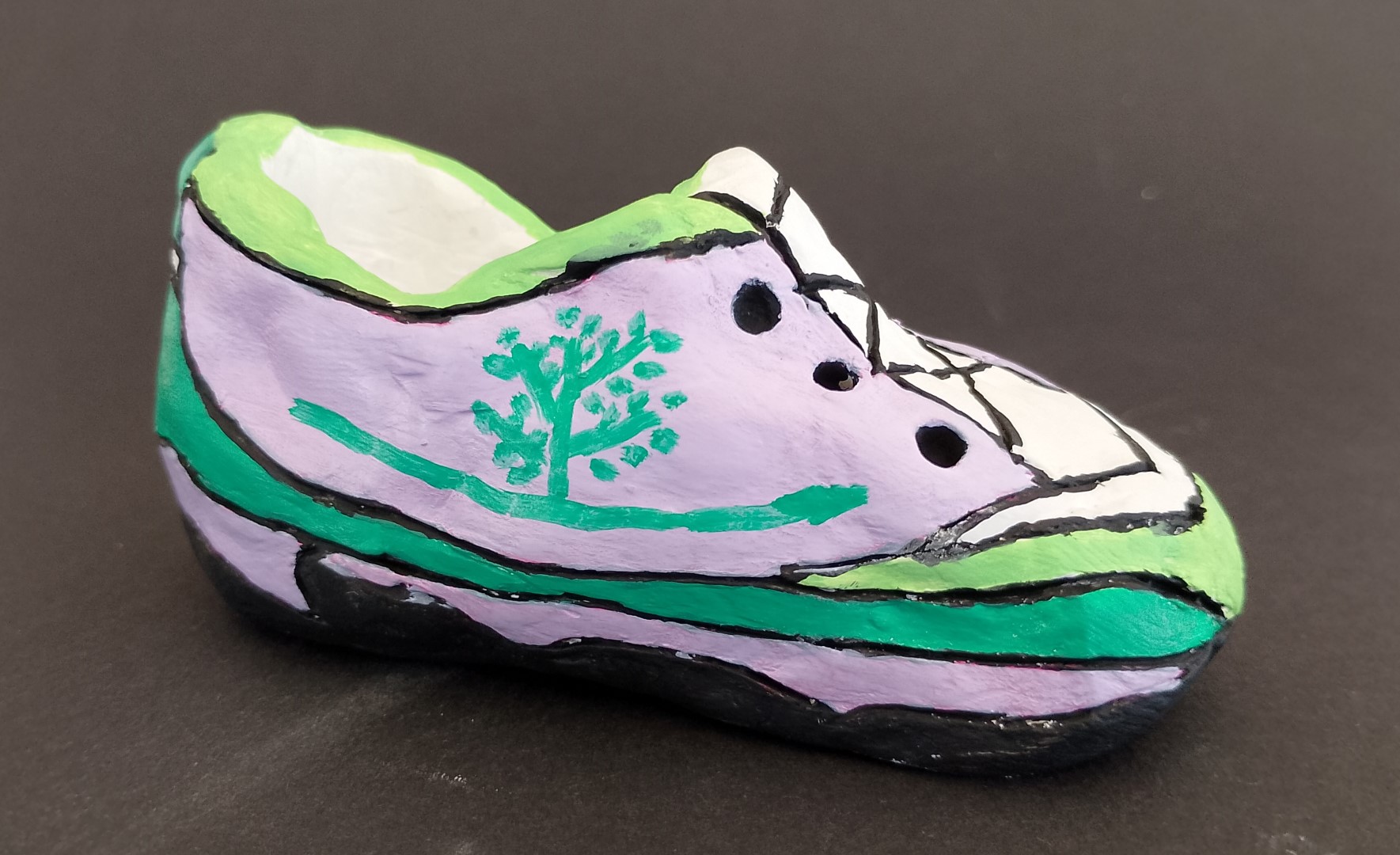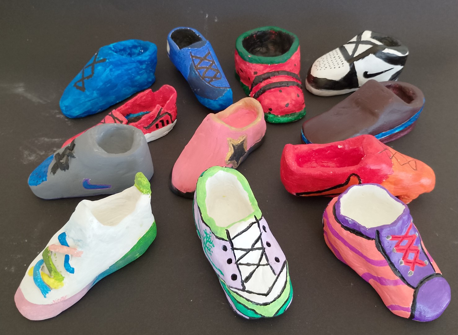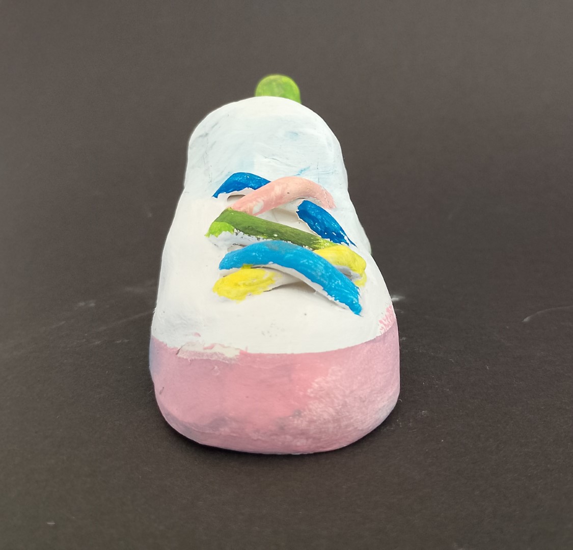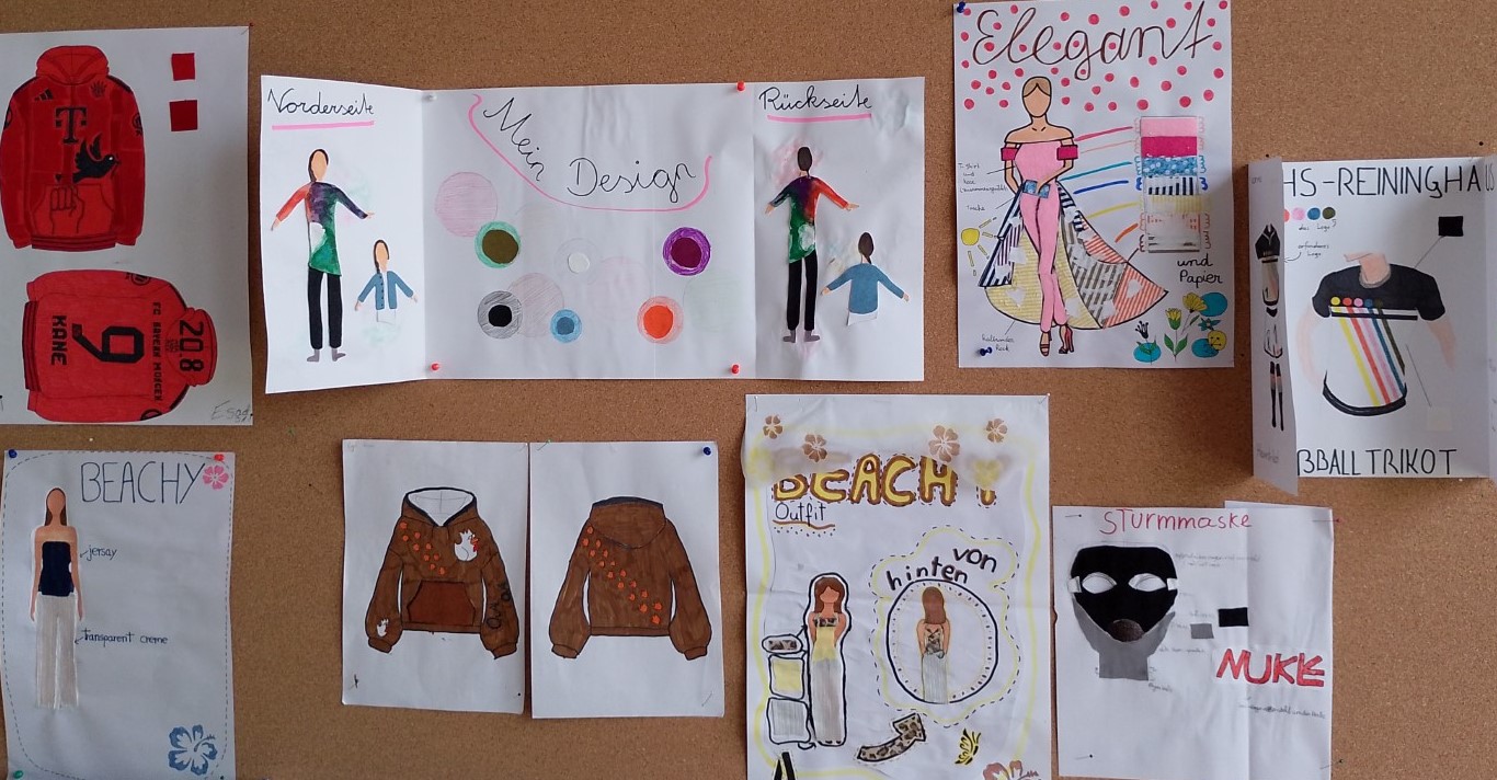 Im Rahmen des Unterrichtsthemas „Einführung in das Modedesign“ setzten sich Schülerinnen und Schüler der 3D sowohl mit den Design- und dem Herstellungsprozessen von Kleidung, als auch mit denen von Schuhen auseinander. Nach einer Einführung über Bedeutung, Geschichte, Kultur, Technik und zeitgenössische Designs samt dahinterstehenden Designer:innen ging es darum, selbst zunächst am Papier Entwürfe und mit Stoffresten Collagen zu gestalten. Auch bei den Schuhen wurde zunächst am Papier entworfen. Dann wurde mit Modellierton ca. im Maßstab 1:2 umgesetzt und farblich den Entwürfen entsprechende Modelle produziert.