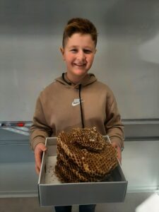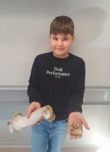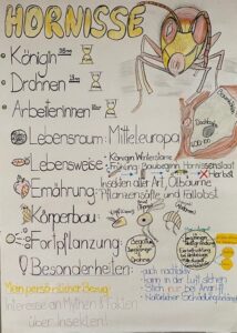 Für besondere Begeisterung sorgten vor allem Konstantins selbst gefundener Oberschenkelknochen einer Kuh und Vedads Hornissennest, aus dem es dank einem eingebauten Lautsprecher sogar lautstark summte und brummte (beide 1f). Theo hatte zur Veranschaulichung der Länge seiner Schlange eine Schnur mitgebracht, anhand derer deutlich wurde, dass so ein Tier von einem zum anderen Ende des Klassenzimmers reichen kann. (1d)