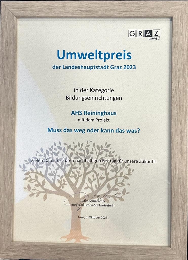 Mit dem Projekt „Muss das weg oder kann das was?“ konnte die AHS-Reininghaus einen mit 500 Euro dotierten Anerkennungspreis im Rahmen des Grazer Umweltpreises gewinnen. Ausgezeichnet wurden die besten Ideen für eine gute Zukunft im Bereich Klimaschutz, Abfallvermeidung und nachhaltige Mobilität.