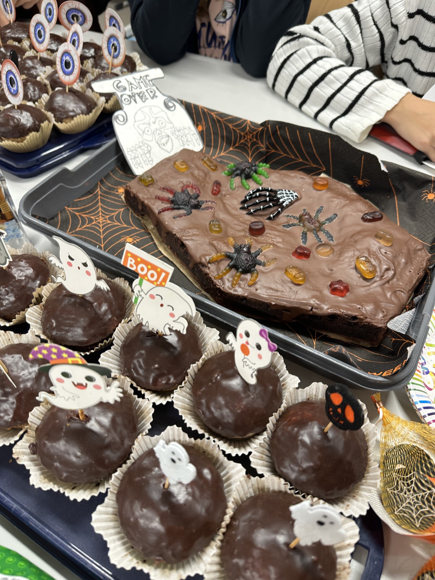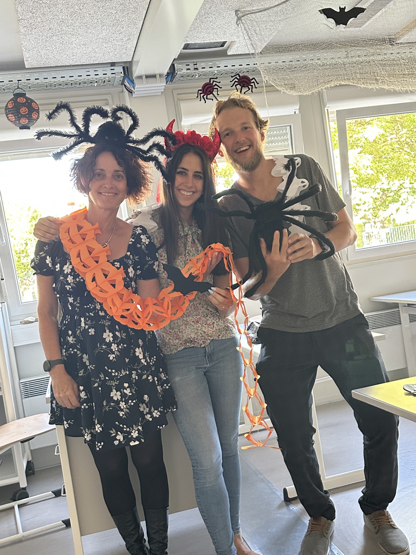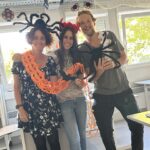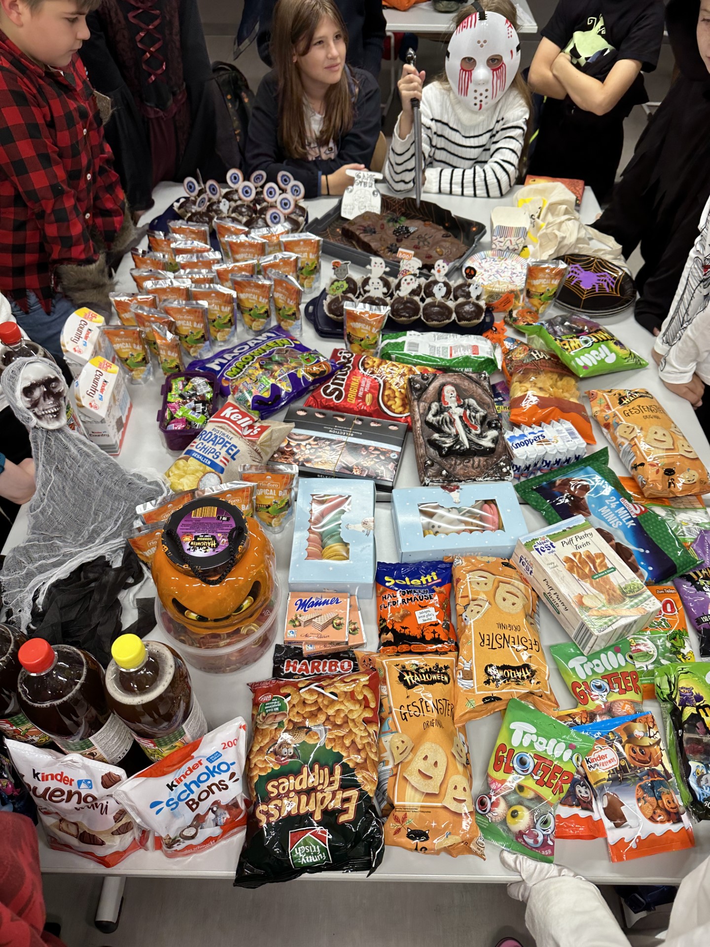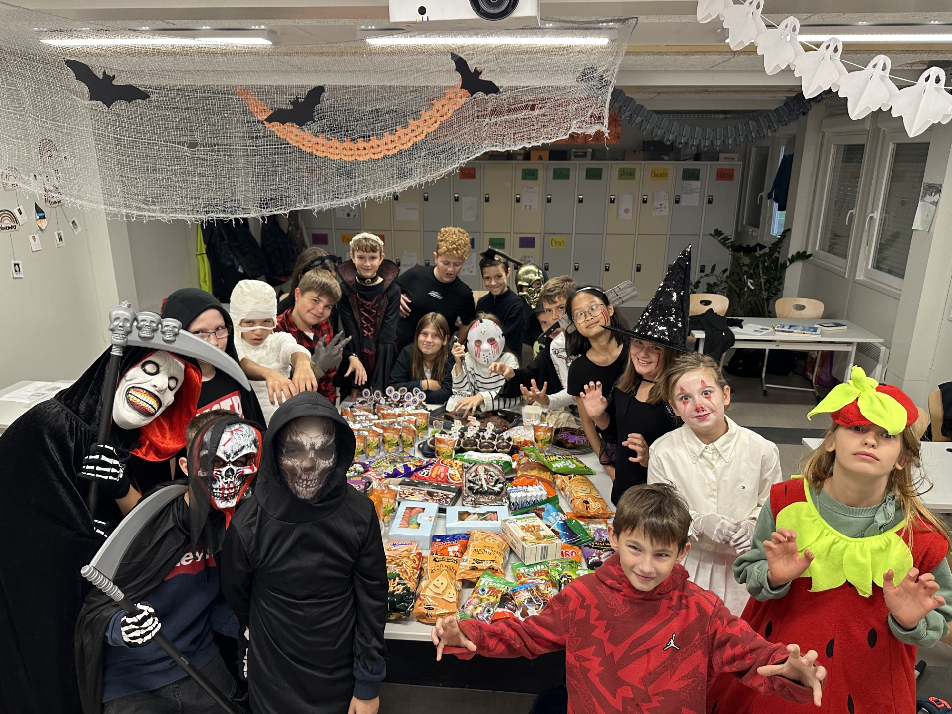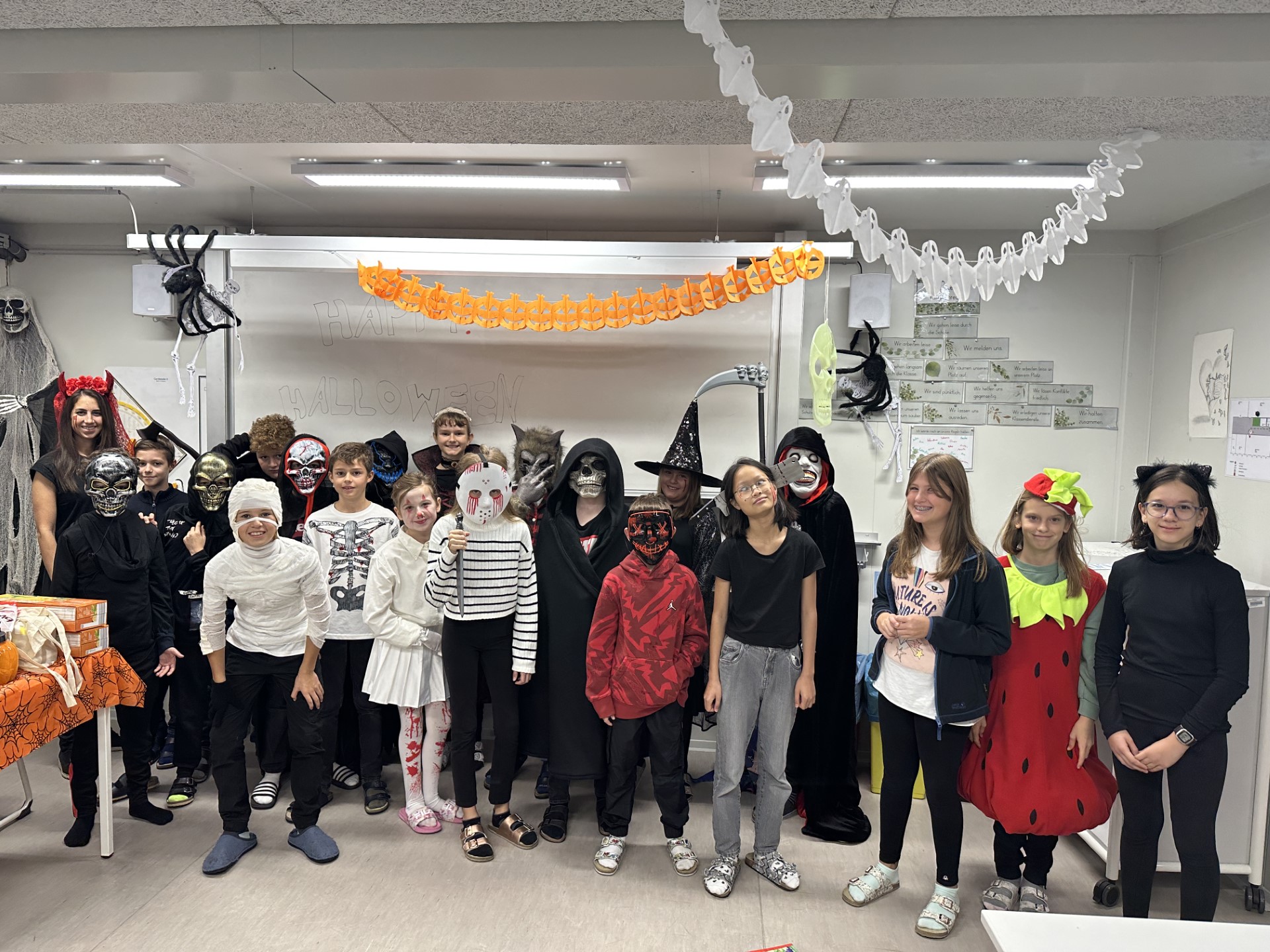 Kurz vor den Herbstferien feierten die drei ersten Klassen mit äußerst kreativen und schaurigen Kostümen eine Halloween-Party. Bereits eine Woche vorher wurden eifrig die Räume mit großen Spinnen, Totenköpfen, Netzen und selbstgezeichneten Bildern dekoriert. Die in Biologie gebastelten menschlichen Skelette fanden so auch ihren Platz in der Klasse. Mit Geistergeschichten, reichlich Süßem und einer ausgelassenen Stimmung wurde der gruseligste Tag im Jahr angemessen zelebriert.