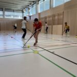 In verschiedenen Übungen verbesserte die Gruppe ihre Koordination, Ballkontrolle und ihr Passspiel. Gegen Ende des Trainings erprobten sie ihr Können in einer vereinfachten Spielform des Landhockeys. Ziel war es, einen auf der gegnerischen Spielseite positionierten Stürmer oder eine Stürmerin gezielt anzuspielen, um Punkte zu erzielen.
