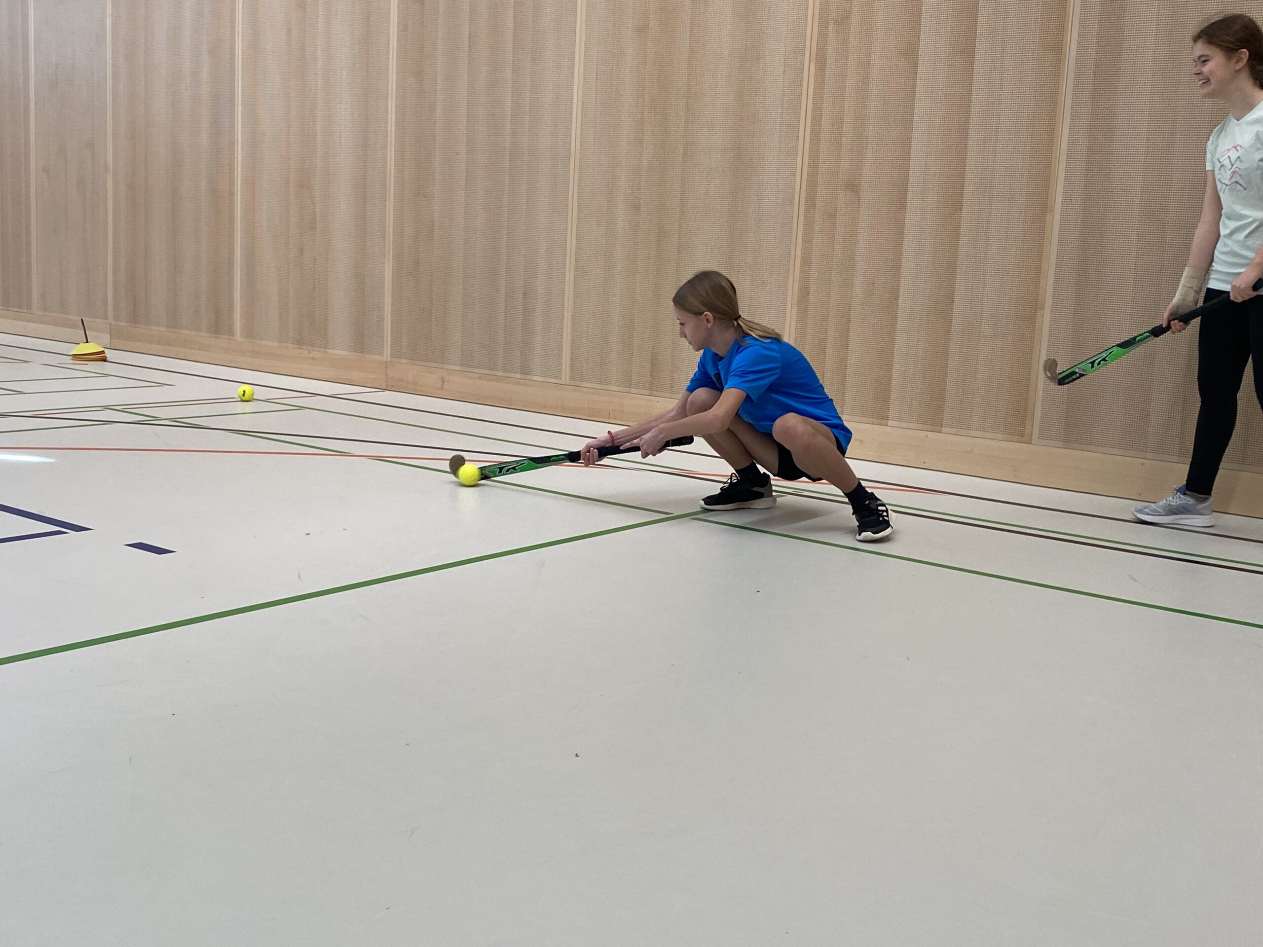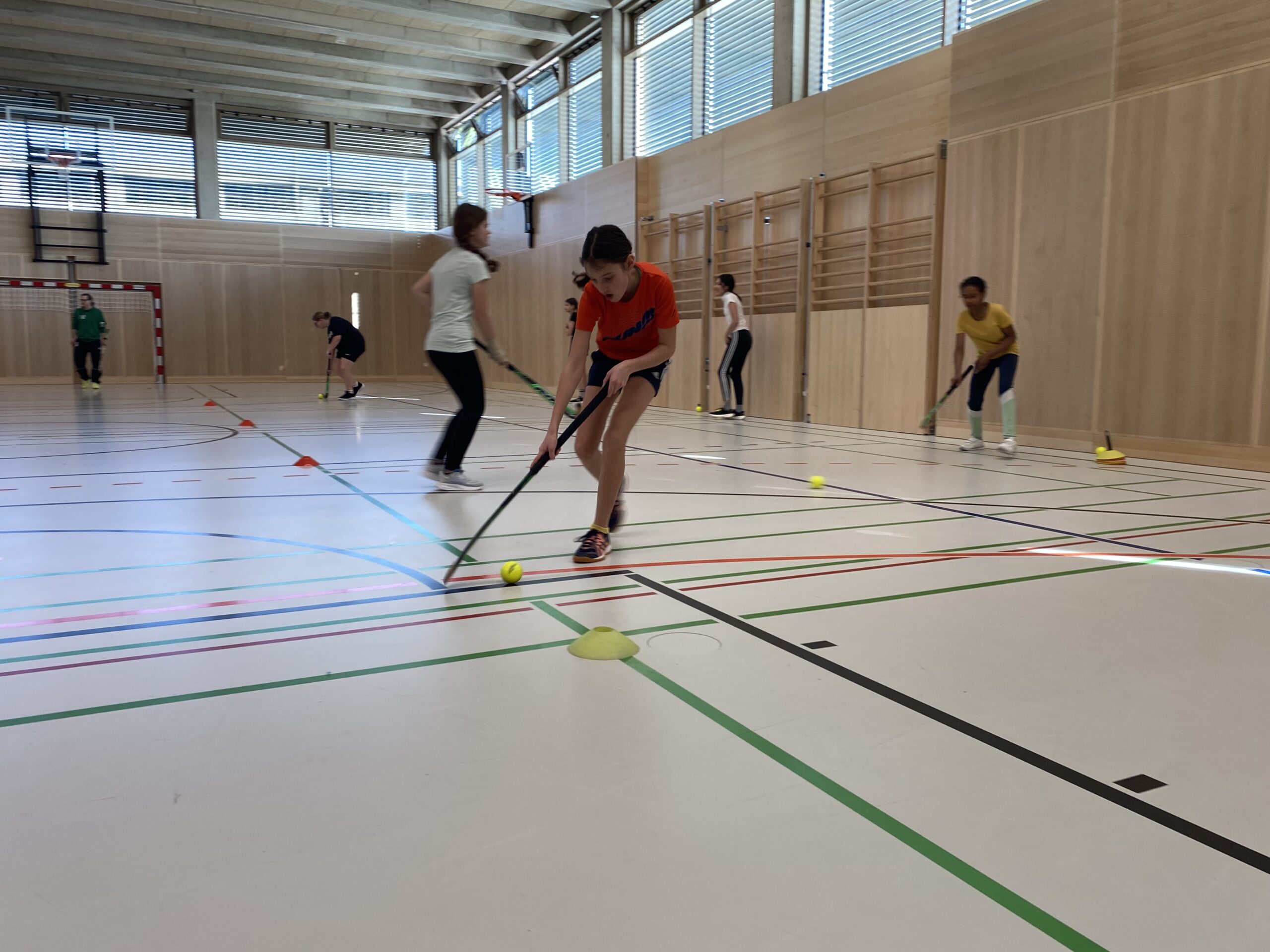 In verschiedenen Übungen verbesserte die Gruppe ihre Koordination, Ballkontrolle und ihr Passspiel. Gegen Ende des Trainings erprobten sie ihr Können in einer vereinfachten Spielform des Landhockeys. Ziel war es, einen auf der gegnerischen Spielseite positionierten Stürmer oder eine Stürmerin gezielt anzuspielen, um Punkte zu erzielen.
