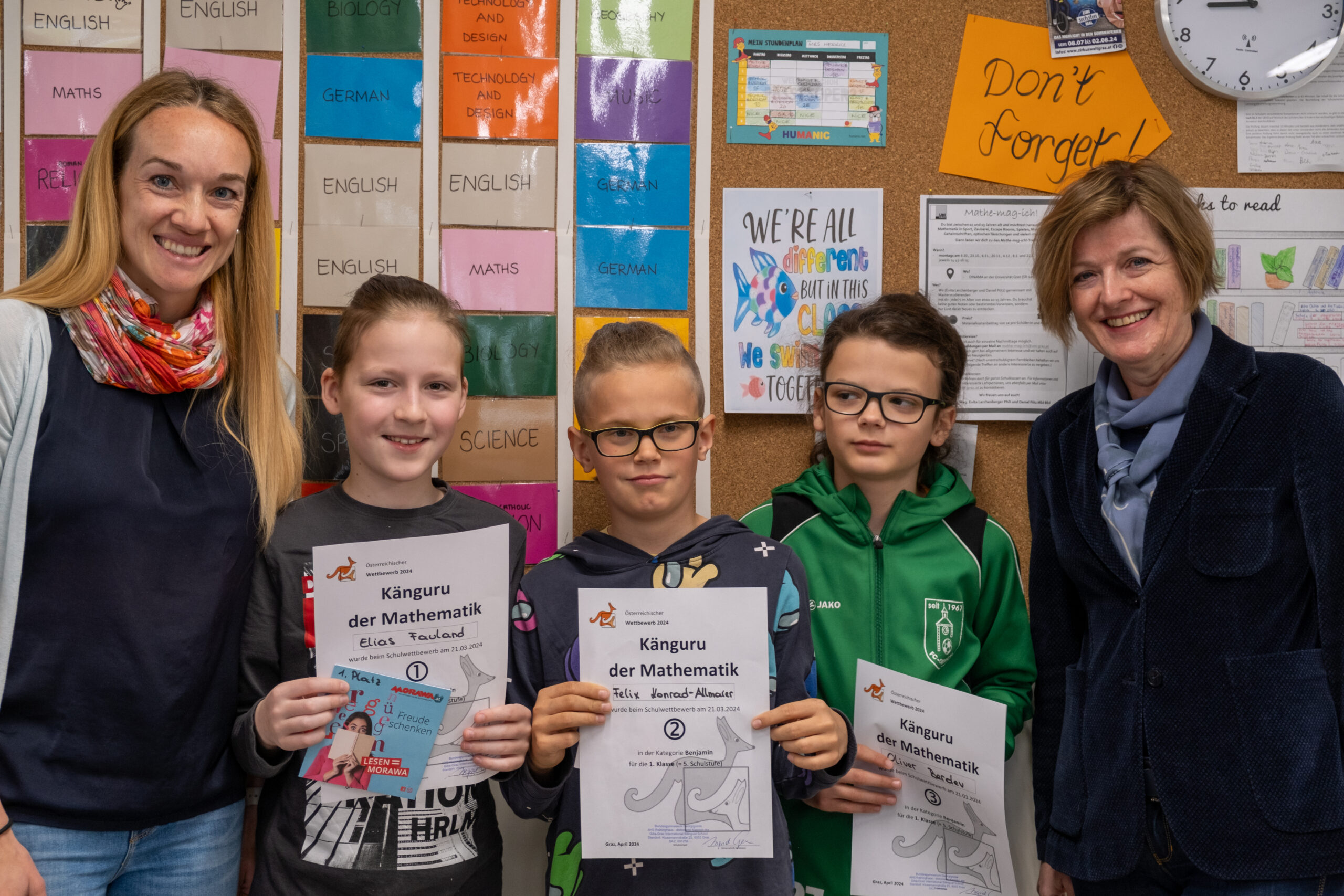 Am letzten Donnerstag vor den Osterferien fand heuer der Känguru-Wettbewerb der Mathematik statt, an dem alle unsere fünf Klassen teilnahmen. Beim Känguru-Wettbewerb geht es vor allem um die Freude an der Mathematik und am Knobeln (mehr noch als ums Gewinnen). Trotzdem haben einige Schüler und Schülerinnen so toll abgeschnitten, dass diese bei einer schulinternen Siegerehrung geehrt wurden.