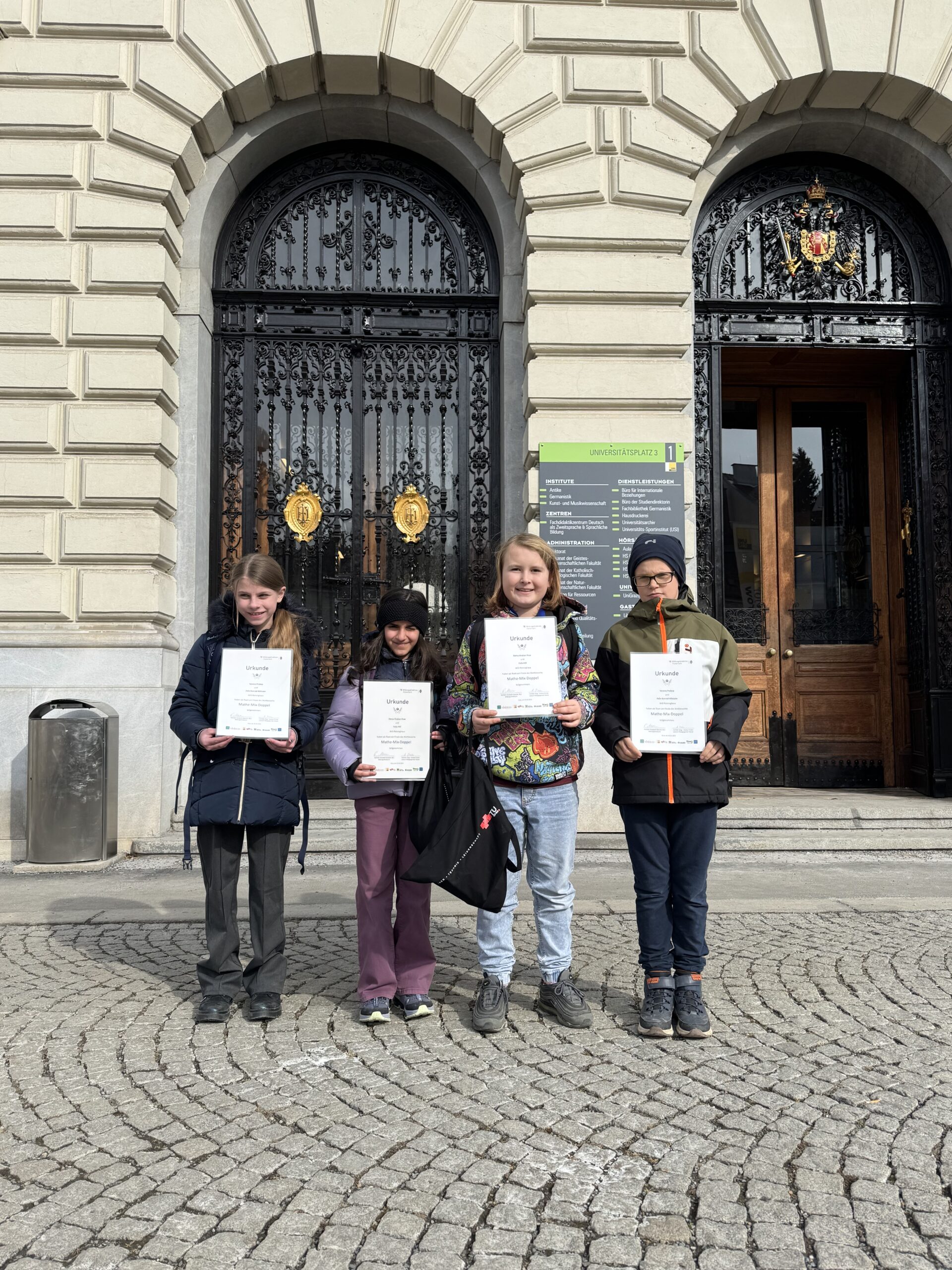 Beim Mathematik-Wettbewerb Mathe-Mix-Doppel stellten sich Schülerinnen und Schüler aus der 1. und 2. Klasse im Team der Herausforderung, knifflige mathematische Aufgaben zu lösen. Die Gewinner-Teams aus der Vorrunde durften ihre mathematischen Fähigkeiten beim steiermarkweiten Finale an der Universität Graz am 25.02.2025 unter Beweis stellen. Wir gratulieren unseren vier Teilnehmer:innen zu ihren großartigen Leistungen!