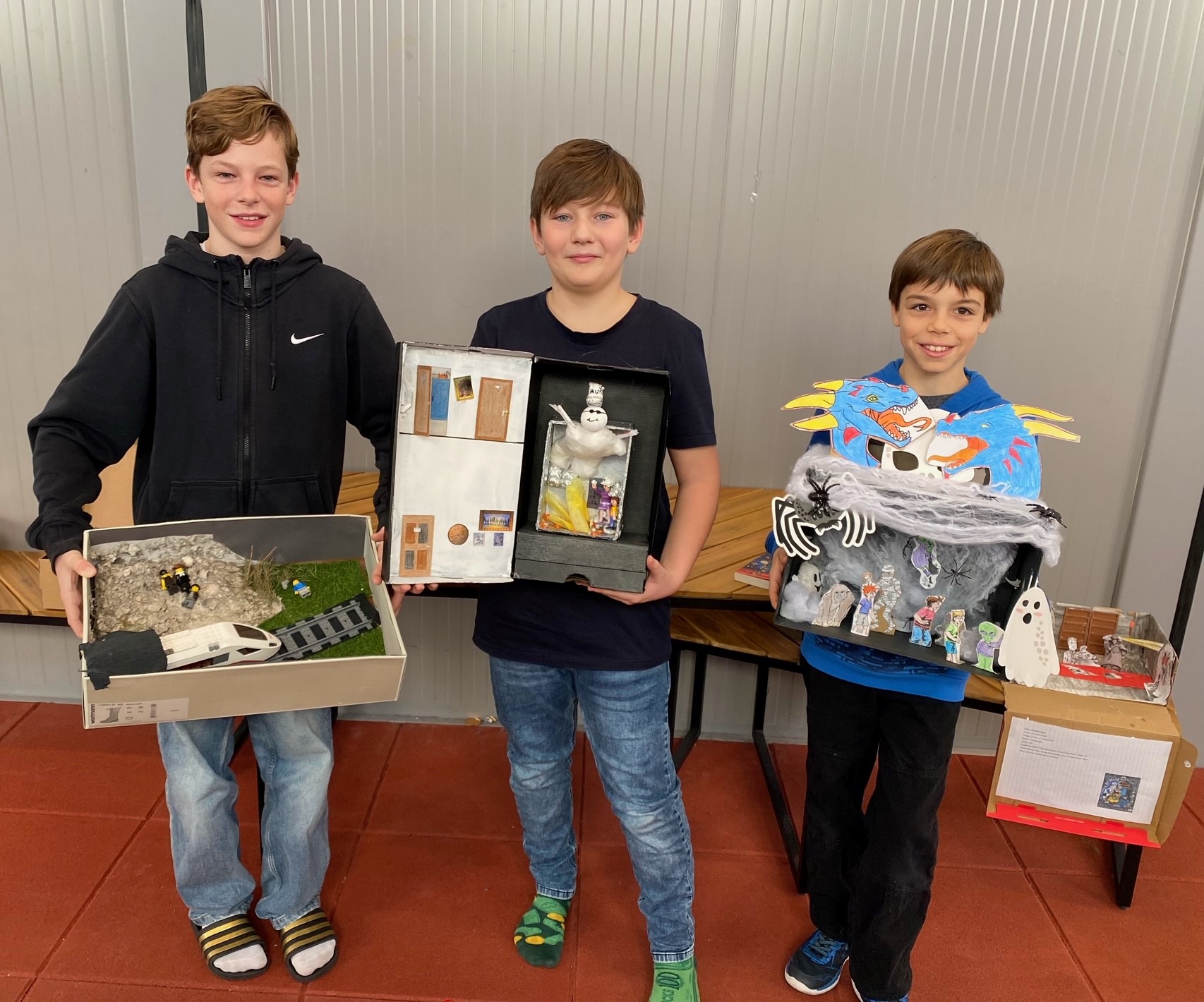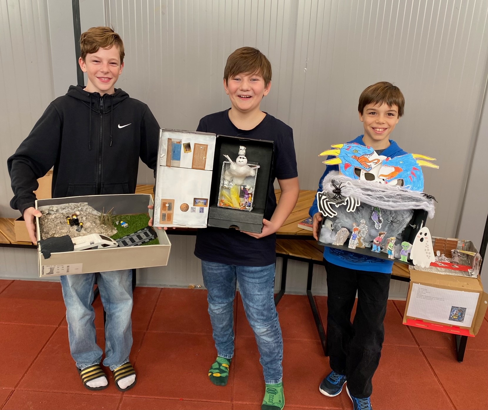 Im ersten Semester hatten die Schülerinnen und Schüler unserer 2. Klassen den Auftrag, ein spannendes oder gruseliges Buch zu lesen und eine Szene in einem Schuhkarton nachzubauen und im Unterricht zu präsentierten. Die Ergebnisse wurden richtig toll! Daher wurden die Werke ausgestellt und von den Schüler:innen der ersten Klassen und den Lehrer:innen bewertet.