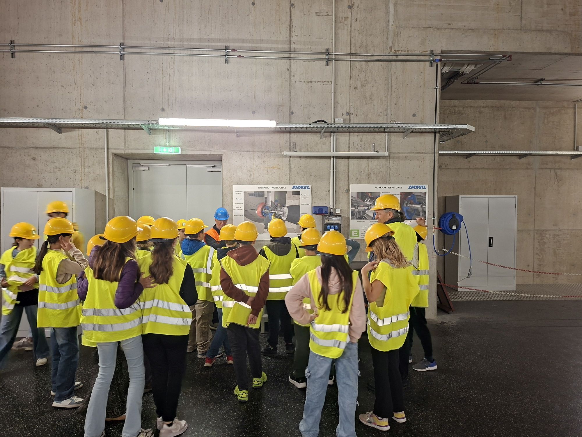 Im Anschluss ging es weiter zum Wasserkraftwerk Graz-Puntigam, wo wir einen Einblick in die Funktionsweise und den Betrieb eines echten Kraftwerks erhielten. 12 Meter unter der Erde durften wir auch die beiden Turbinen, das sogenannte Herzstück des Kraftwerks, besichtigen. Fischtreppe, Radwege und die angelegten Ökozonen rund um das Kraftwerk waren ebenfalls Teil der KW-Führung.