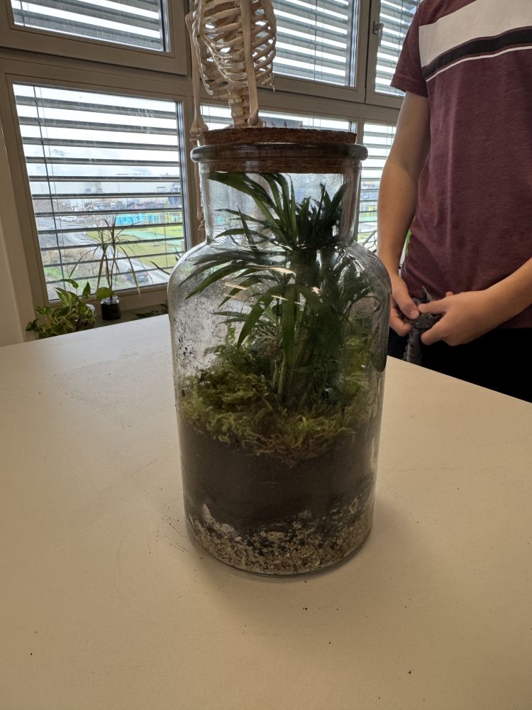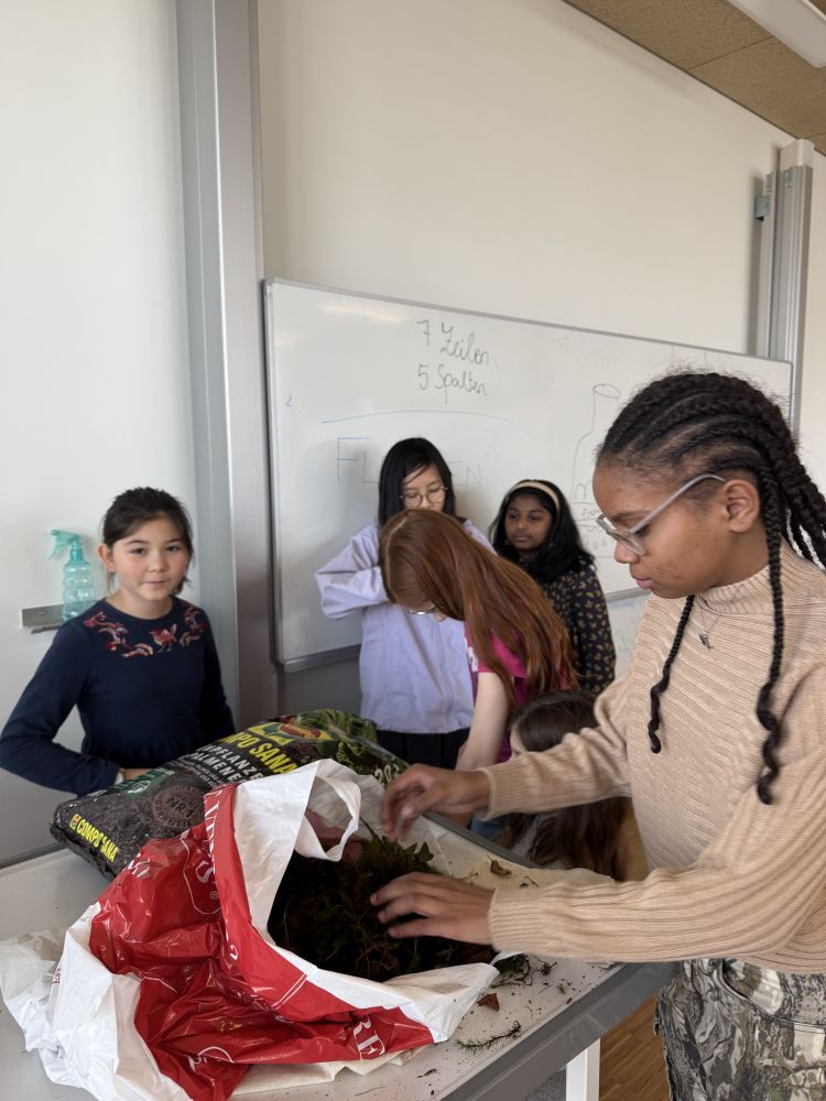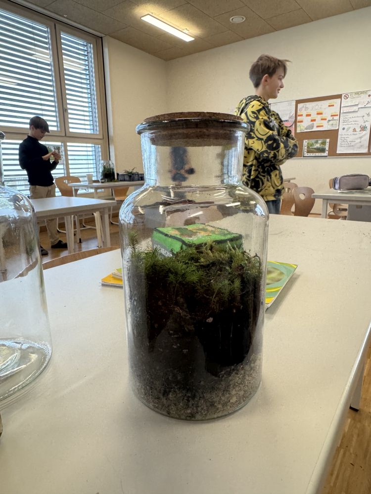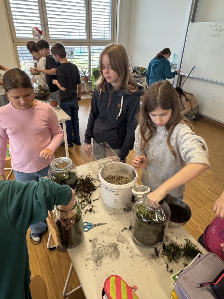 Zu Beginn wurden die benötigten Materialien vorbereitet: Glasgefäße,Kies als Drainageschicht, Aktivkohle zur Filterung, Blumenerde sowie kleine Pflanzen und Moos. Die Schüler:innen befüllten die Gläser schichtweise und lernten dabei, welche Aufgabe jede Schicht für das Ökosystem erfüllt. Anschließend wurden die Pflanzen ins Glas gesetzt und mit Wasser versorgt. Der Flaschengarten zeigt, wie Lebewesen und Umweltfaktoren in einem Ökosystem zusammenwirken.