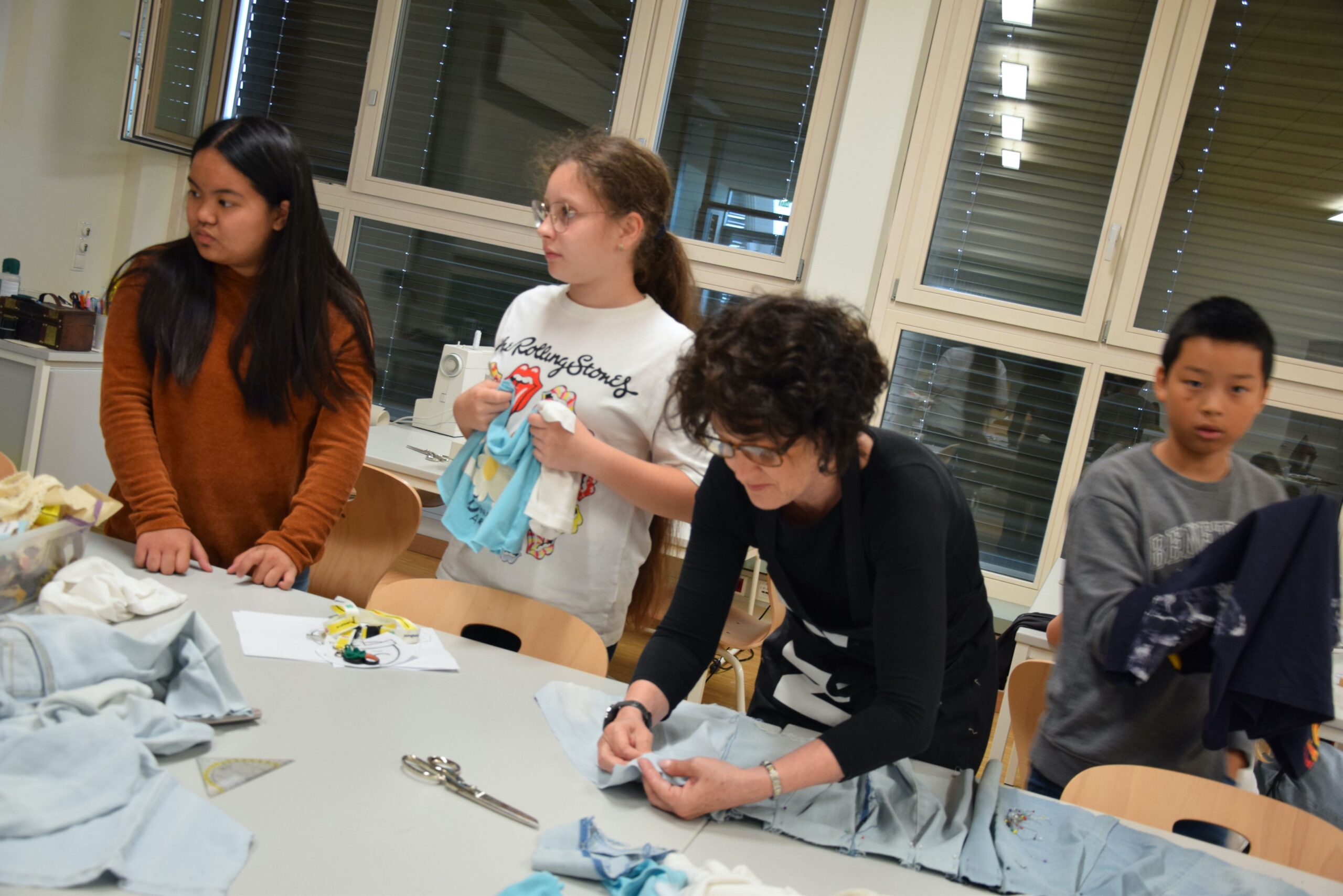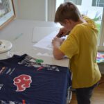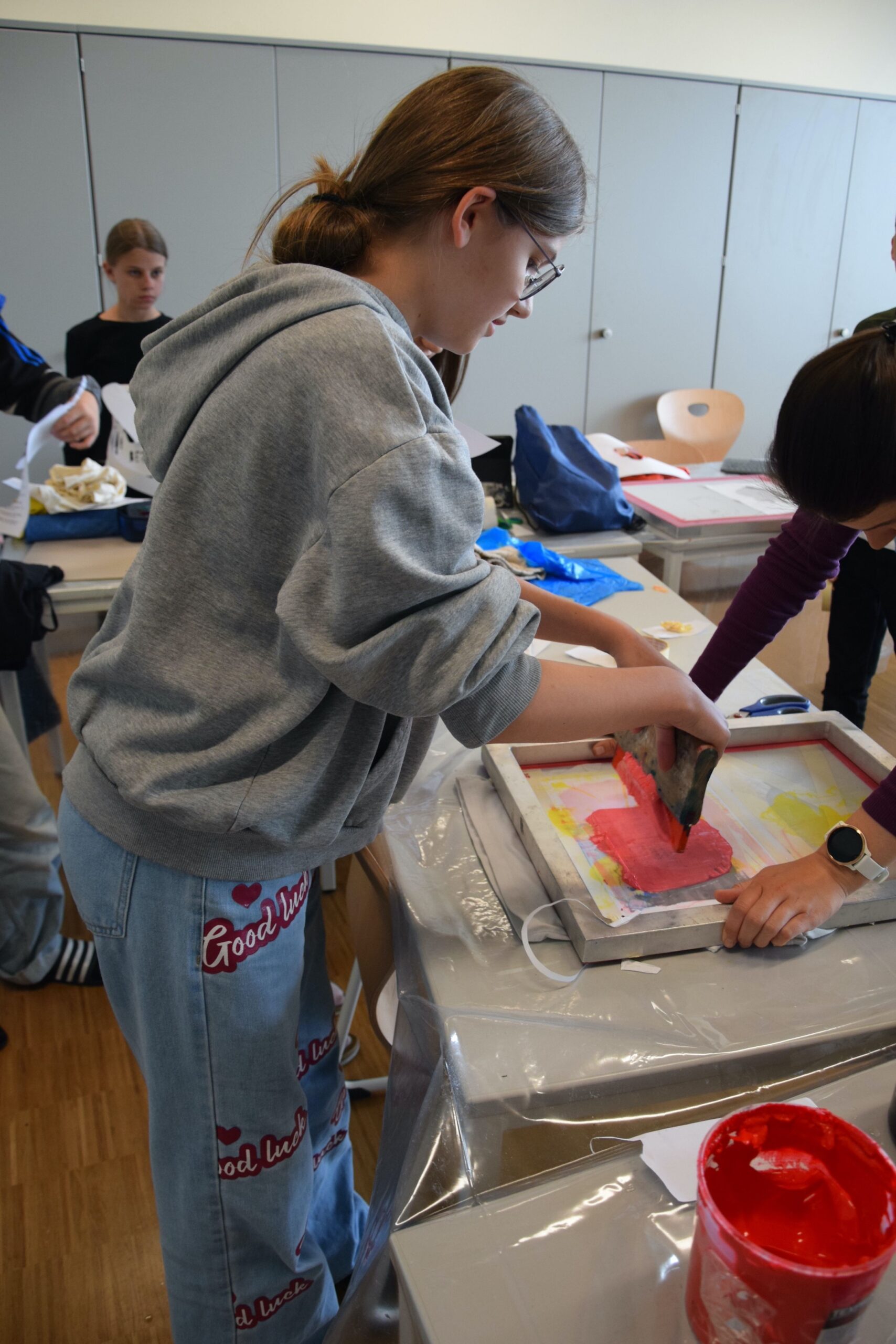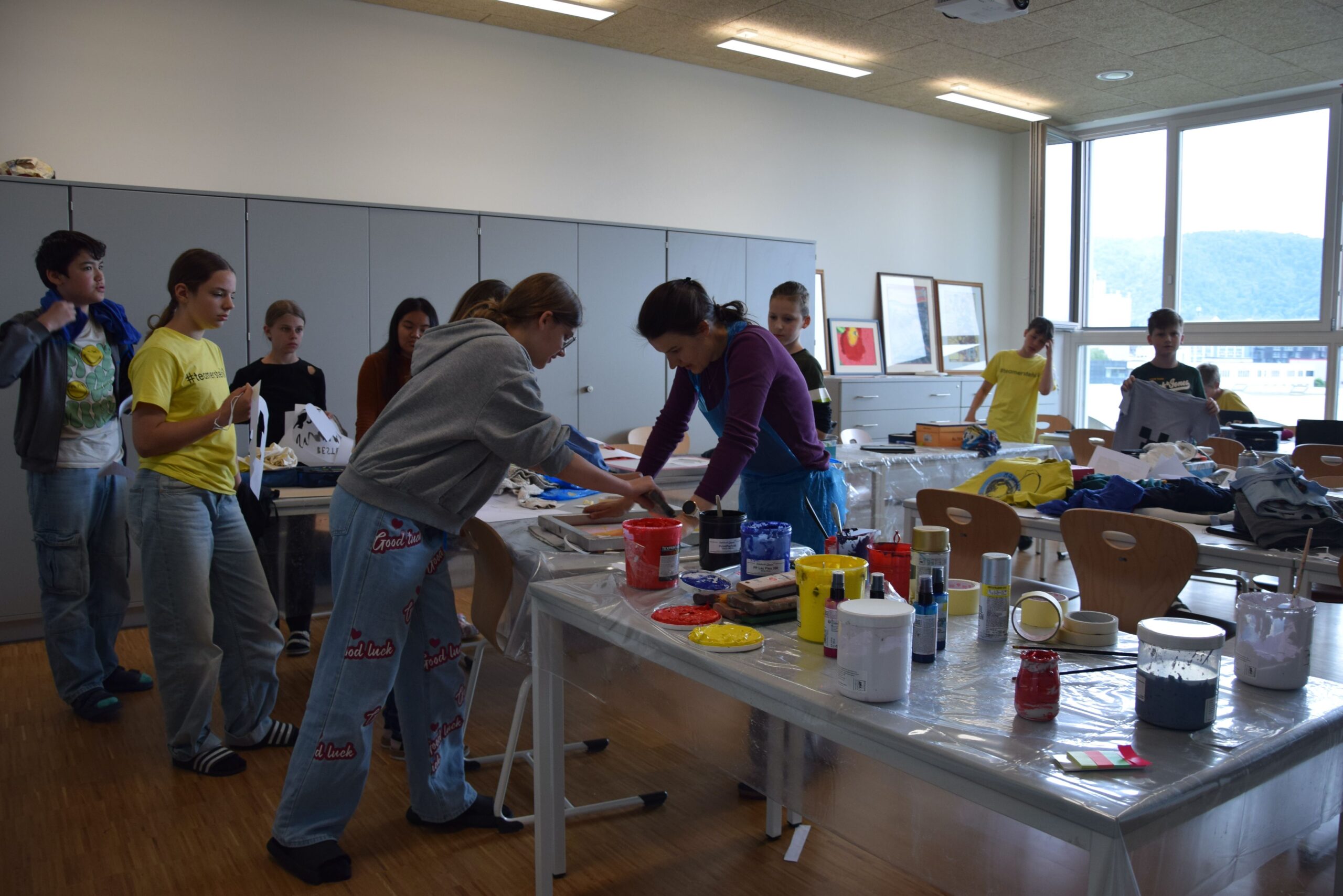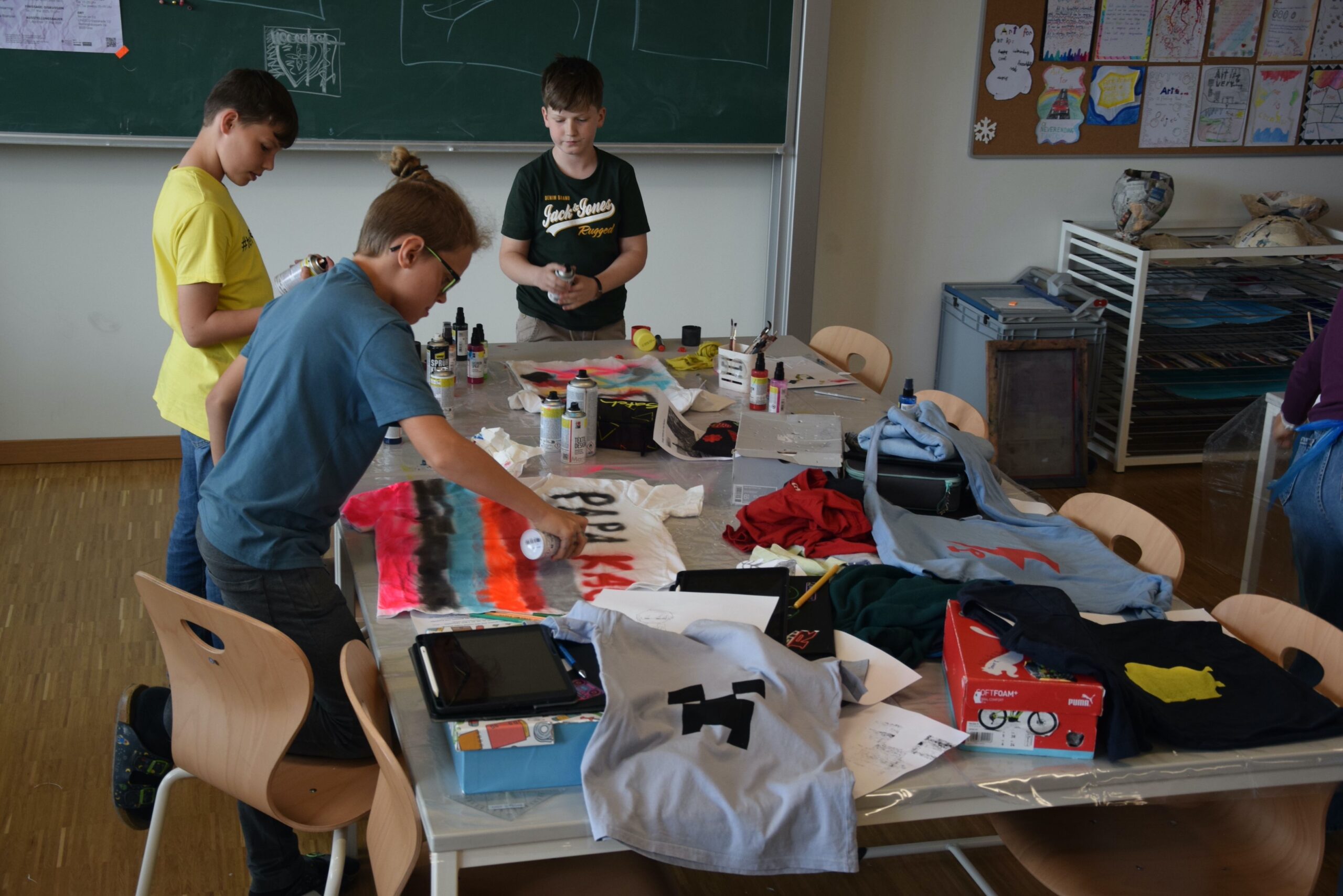 Im Workshop „Bis es mir vom Leibe fällt“ konnten die Schüler:innen der 2e  nicht nur eigene künstlerische Motive entwerfen, drucken und auf Textilien sprayen, sondern auch komplett neue, spannende Outfits gestalten und nähen.