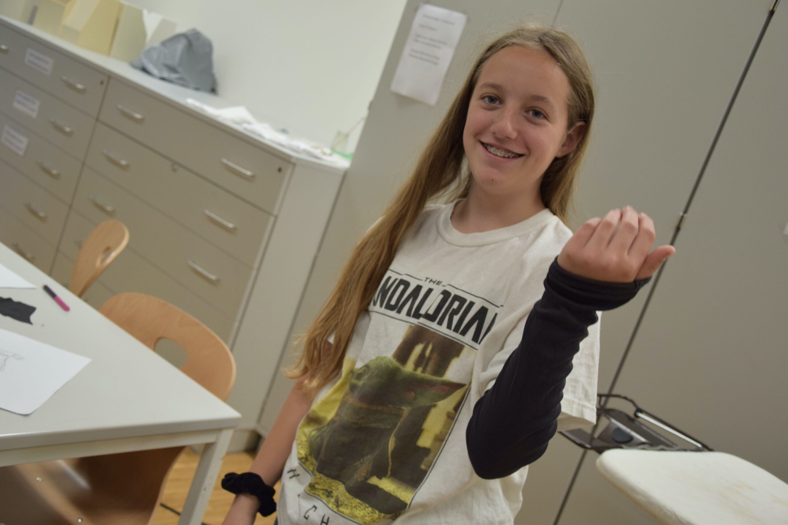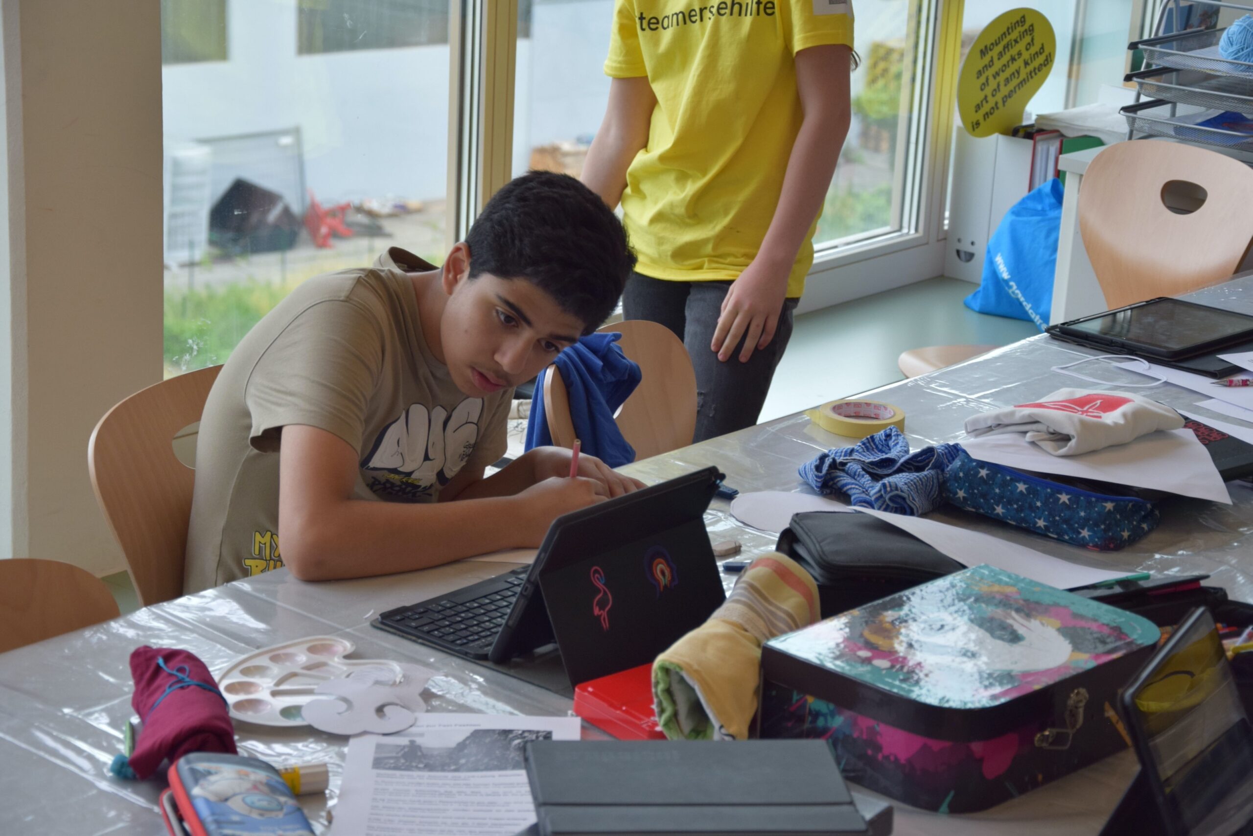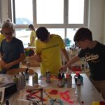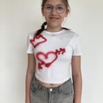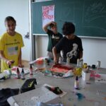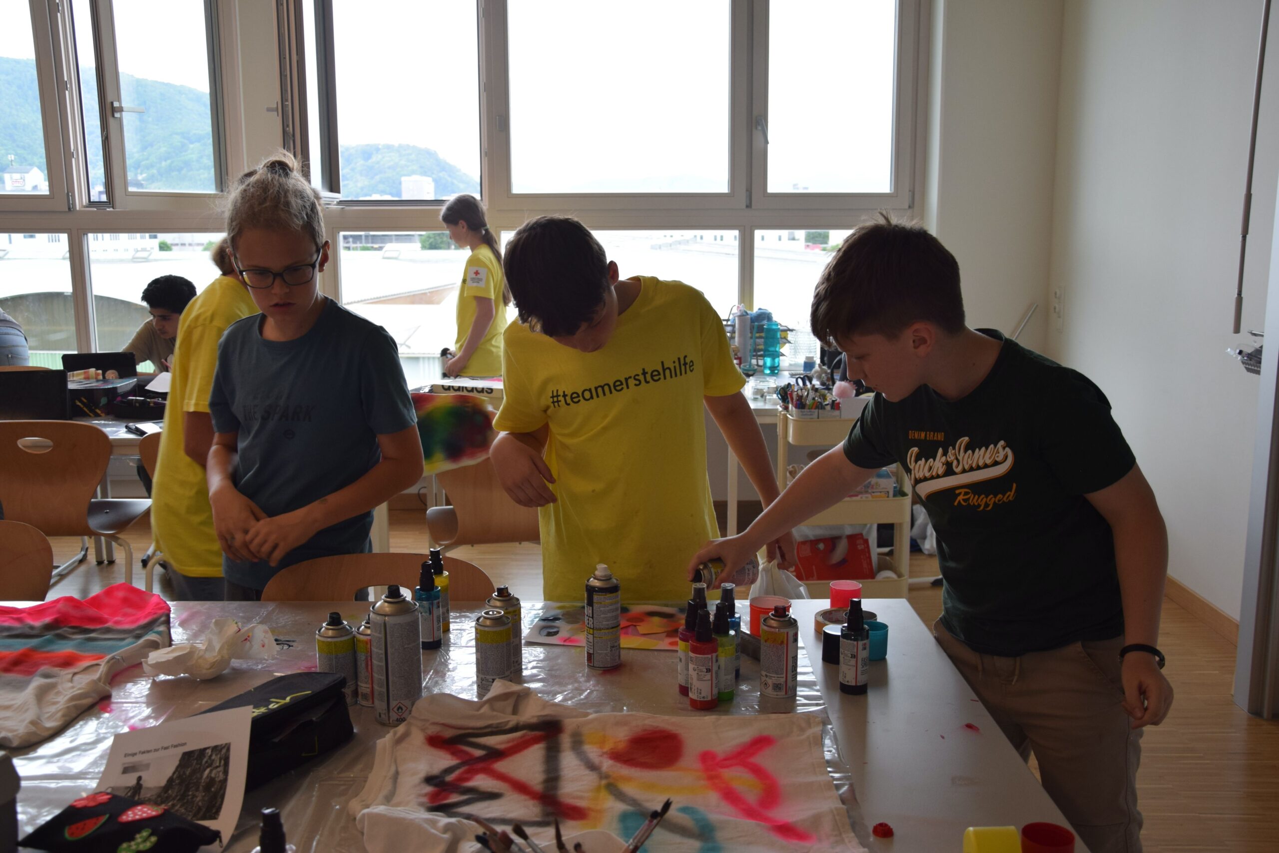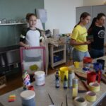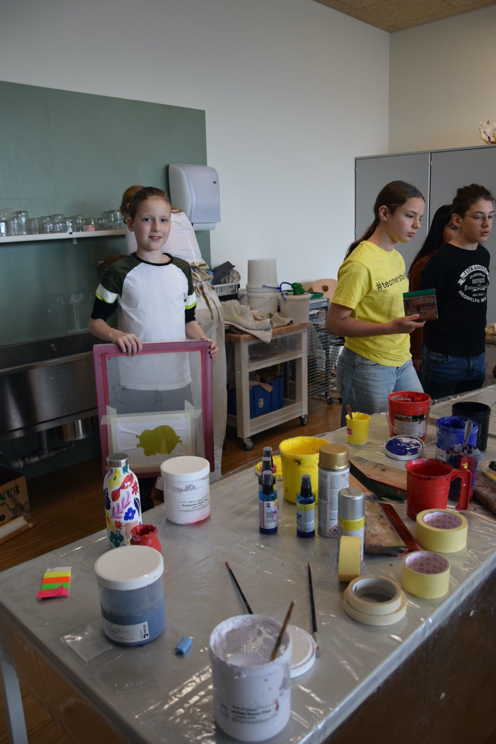 Im Workshop „Bis es mir vom Leibe fällt“ konnten die Schüler:innen der 2e  nicht nur eigene künstlerische Motive entwerfen, drucken und auf Textilien sprayen, sondern auch komplett neue, spannende Outfits gestalten und nähen.