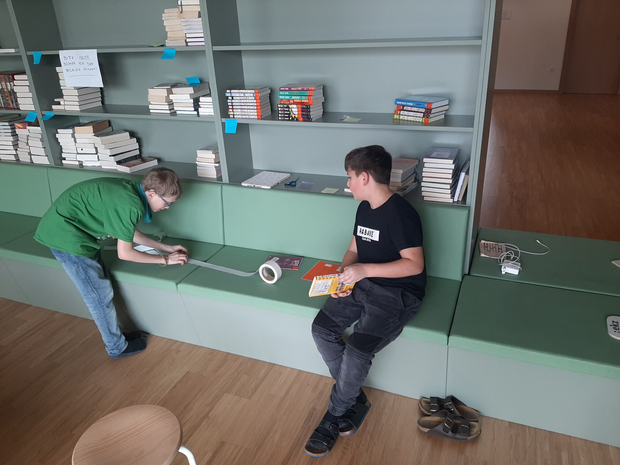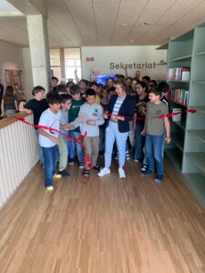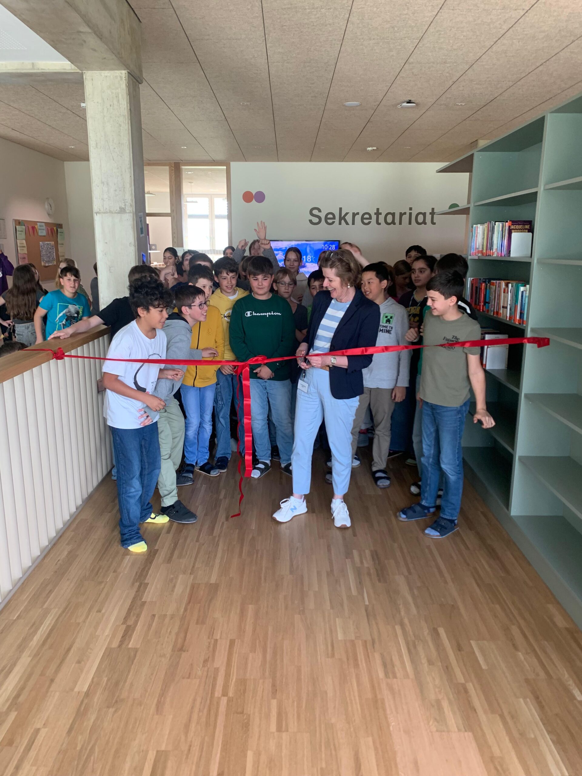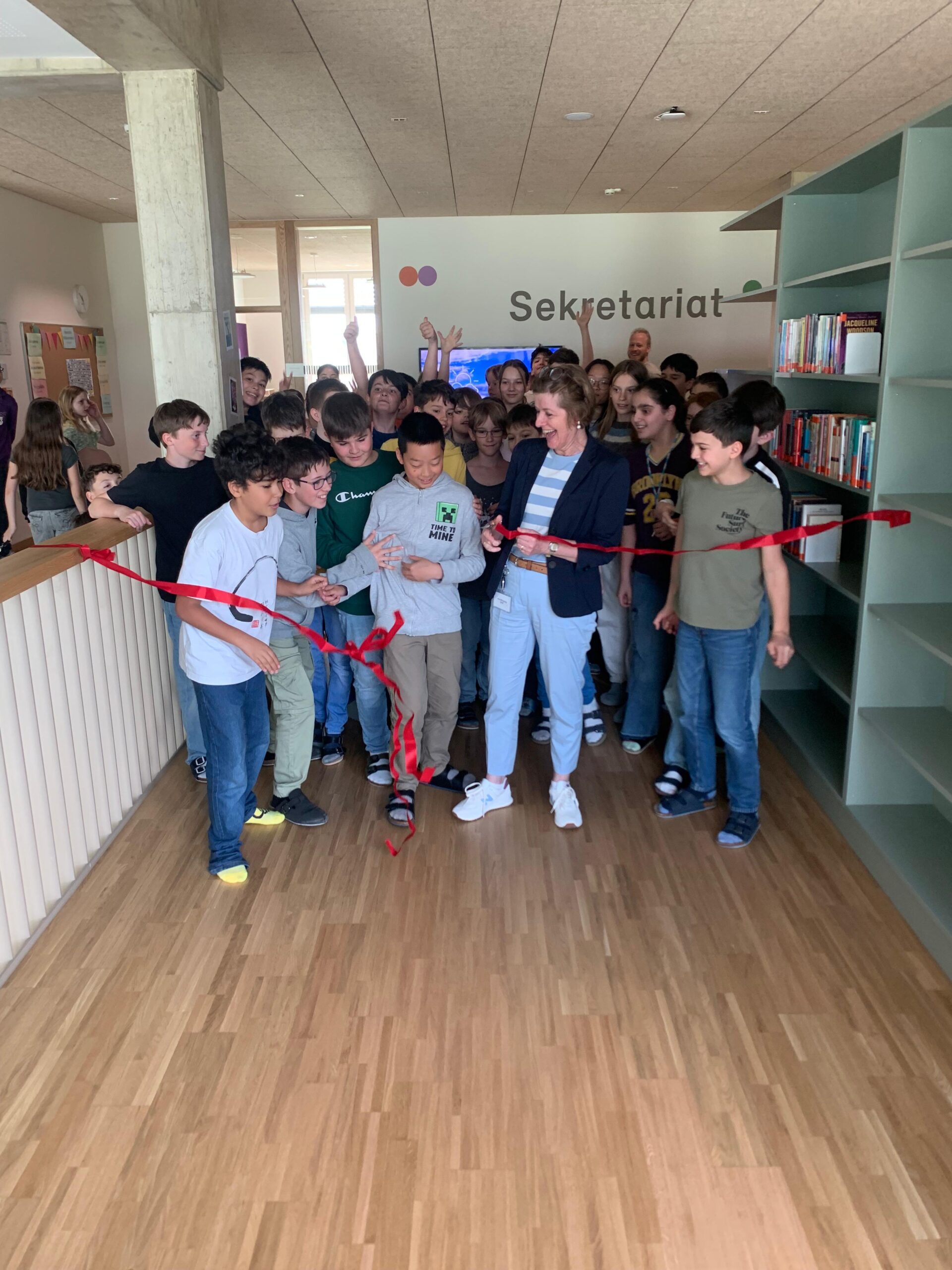 Am Donnerstag, dem 24. April – nur einen Tag nach dem Welttag des Buches – war es dann endlich so weit: Im Beisein vieler lesebegeisterter Schüler:innen durchschnitt Frau Gehrke feierlich das Eröffnungsband. Damit war der Startschuss gefallen – und die langersehnten Bücher konnten zum ersten Mal ausgeliehen werden.